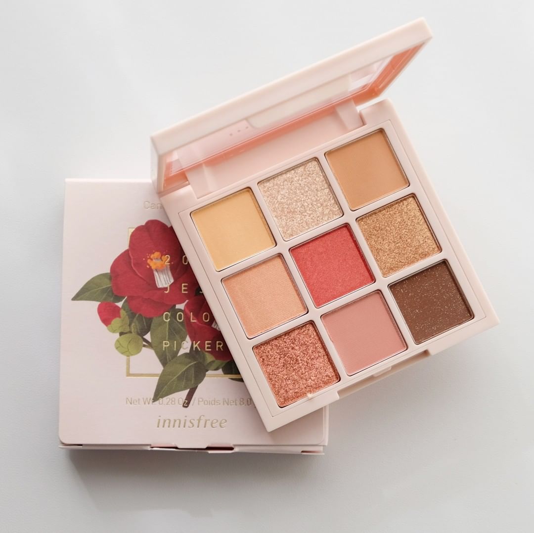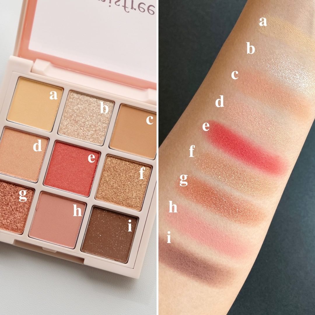 📝椿の花から着想を得た9色をセットしたパレット。椿のようなレッドカラー(e)がポイントですが、ベージュ〜ピンク系のカラーがセットされていて、普段使いしやすいのも嬉しい❗️発色の良さ&ラメ感の美しさはさすがイニスフリー。この価格で9色入りは絶対買いです✌️