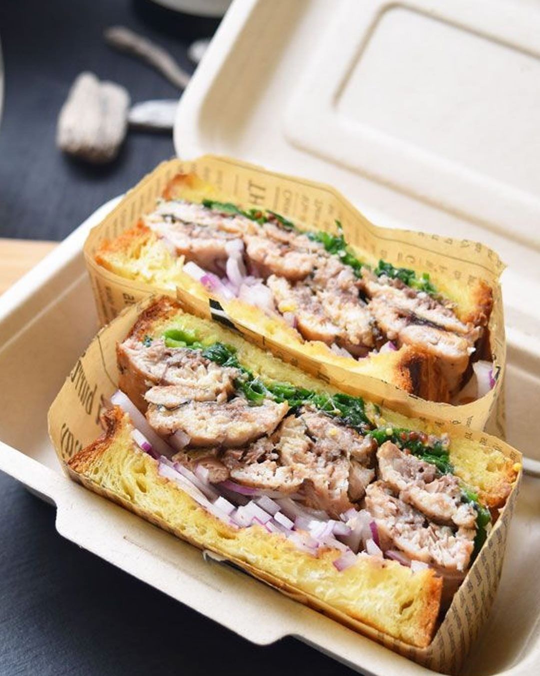 4️⃣バターブレッドをトーストし、3の肝バターを塗り、2のさんまと1の青ねぎ、赤玉ねぎをはさむ。ワックスペーパーで包み、半分に切る。