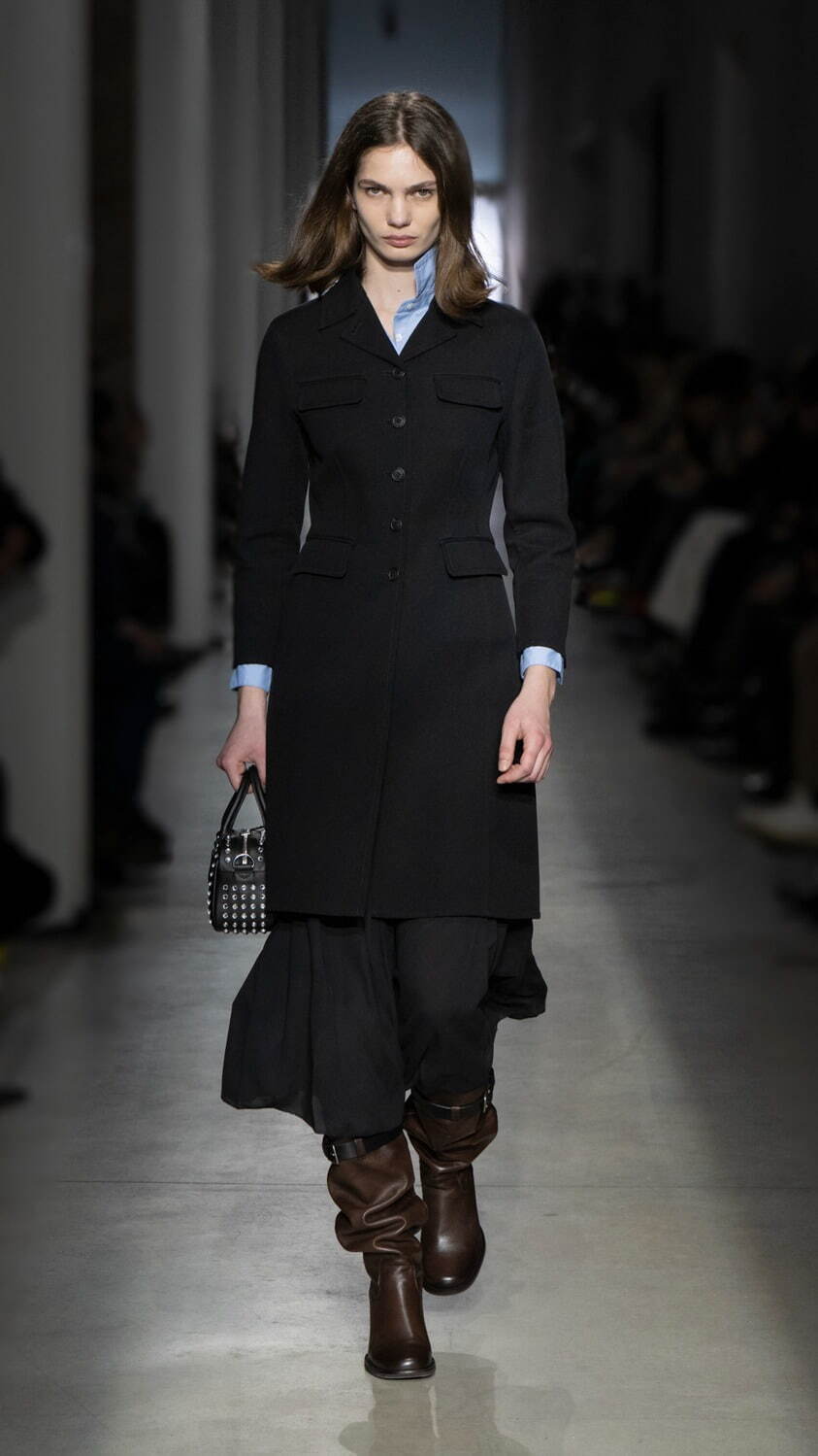 シルエットは、身体に優しく寄り添う細身のラインが印象的。シングルコートやジャケットには、ウエストにダーツをしっかり仕込み、ウエストに自然なカーブを描いている。あらゆるコーディネートにあわせられたテキサススタイルのヒールブーツは、足首にクシュっとボリュームを出し、タフな印象をプラスした。