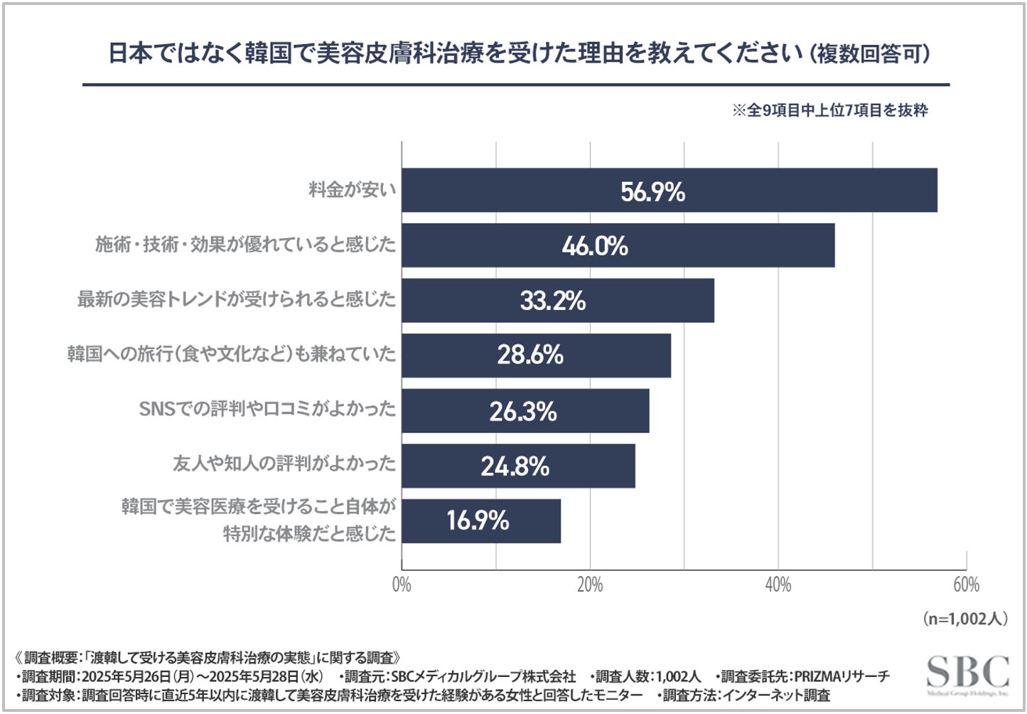 SBCメディカルグループホールディングス(本社:米国カリフォルニア州、CEO:相川佳之)の連結子会社であり、全国の医療機関への経営支援事業を展開するSBCメディカルグループは、直近5年以内に韓国で美容皮膚科の治療を受けたことがある女性1,002名を対象に、渡韓理由、施術内容、満足度、今後の意向などについて調査を実施しました。