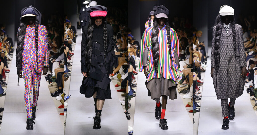 「コム デ ギャルソン・オム プリュス(COMME DES GARCONS HOMME PLUS)」は引き続き、平和を願う。ただ、そのアプローチは半年前、ミリタリーウエアを解体・再構築して、戦争や紛争の際に着用する洋服が本来の目的以外の場面で楽しまれることを願うことで、痛烈なメッセージを放ったときとは異なっている。今シーズンの主役は、スーツだ。川久保玲は、「私たちを平和や愛、そして友愛に導く、シャーマンのように力強い人物が必要と考えた」という。そこで、時には特別な意味を持ち、時には何気なく纏うことで、人間が長く共に歩んできたスーツにフォーカスを当てたのだろう。