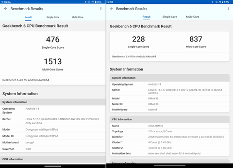 こちらは「Geekbench 6」でのベンチマーク結果。こちらもやはり2倍近い差がある表示のクオリティは十分。バッテリの持ちも問題なし