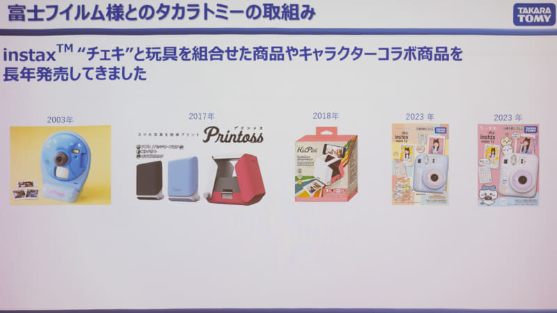 タカラトミーは、チェキと組み合わせたおもちゃを販売するなど、両社は製品でのコラボレーションを長年行ってきた。古くはプリクラが流行っていた2003年、家でプリントシールが作れるおもちゃ「おうちでプリクラDX」を発売。内部にチェキを組み込んだ製品だった。