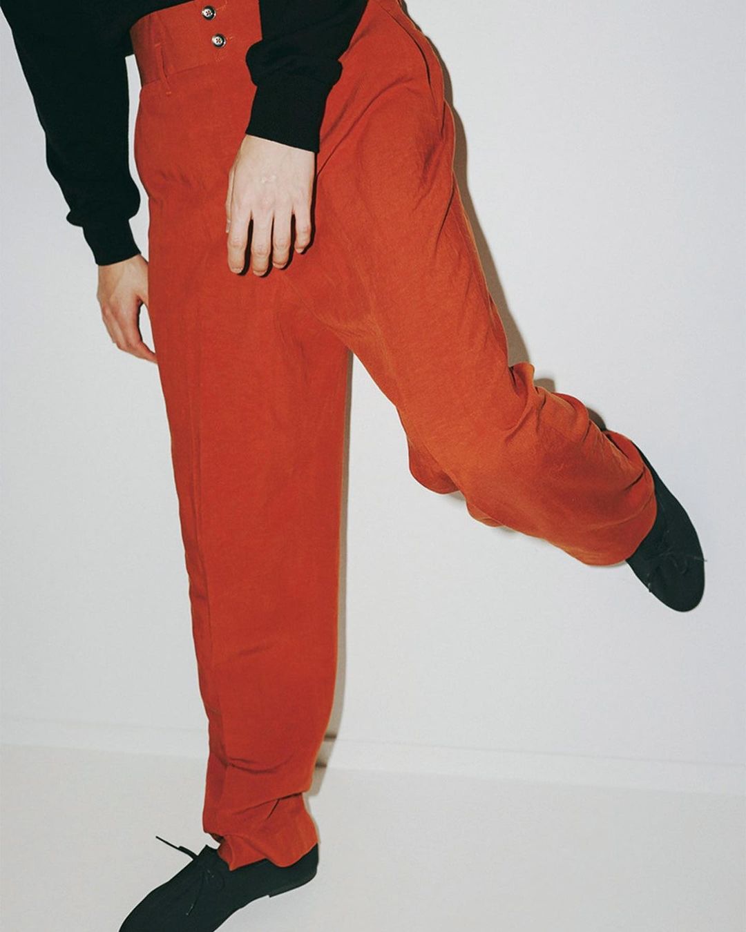 タキシードパンツのようなウエストデザインが印象的な美シルエット。イタリアの老舗ファクトリーとのコラボはありそうでなかったダークオレンジ。