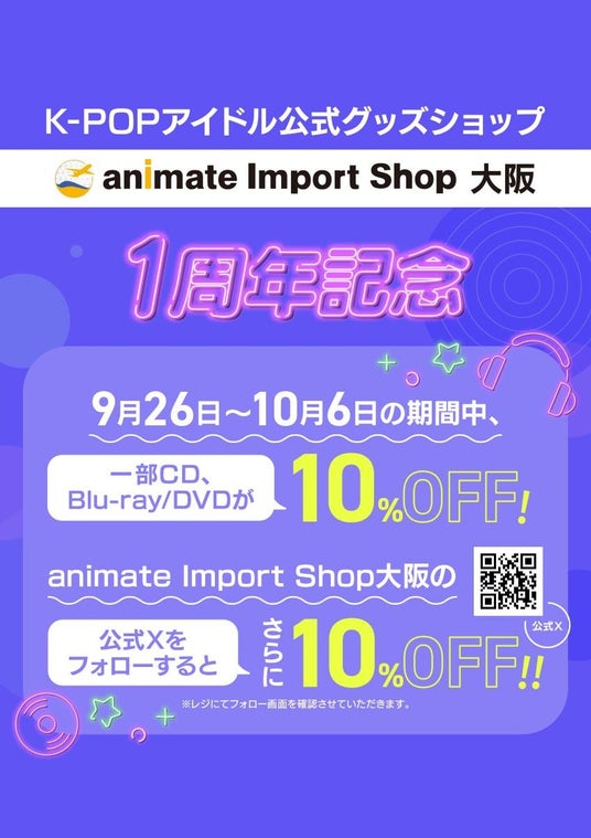 実施内容:店内の一部商品を10%OFFで販売いたします。「animate Import Shop大阪」のXアカウントをフォローし、レジでフォロー画面をご提示いただいた方は、さらに10%OFFになります!