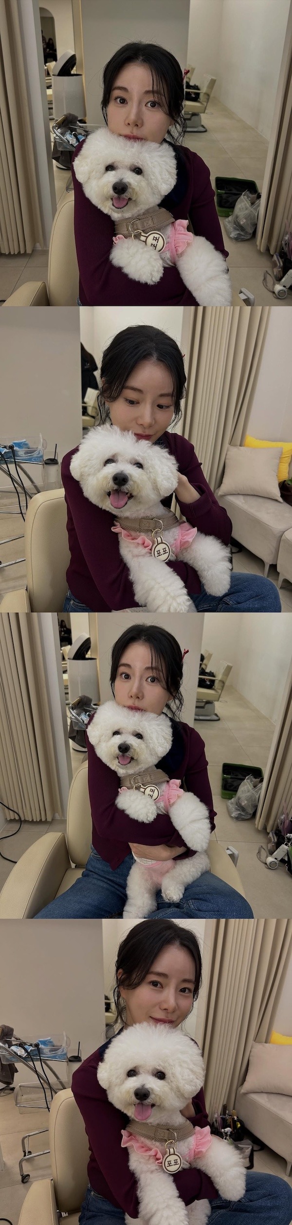 写真に写ったのは、知人が飼ってる犬・ポポちゃんを抱っこしたイム・ジヨンの姿。白くふわふわな被毛を誇るポポちゃんに顔を近づけた彼女は、カメラを見つめながら愛らしい雰囲気を醸し出している。