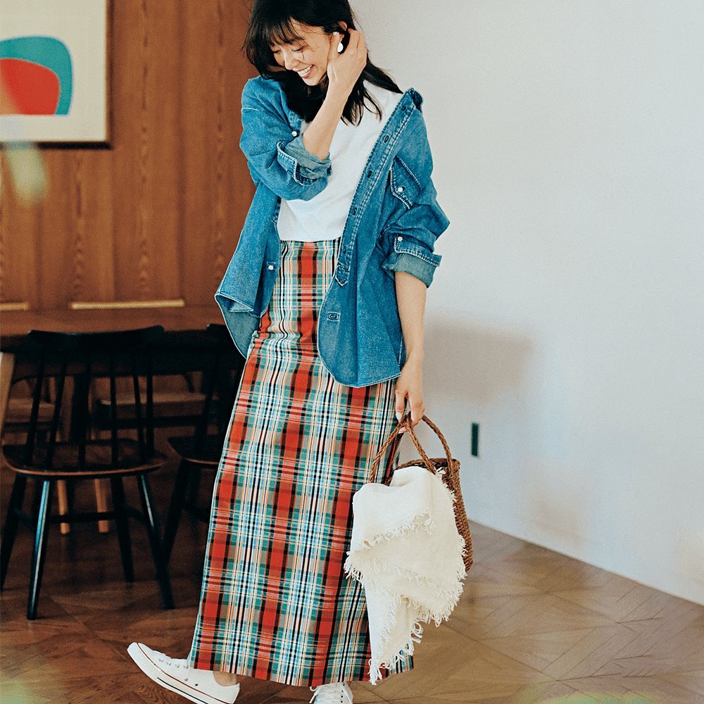 チェック柄が可愛らしいタイトスカートを合わせて、