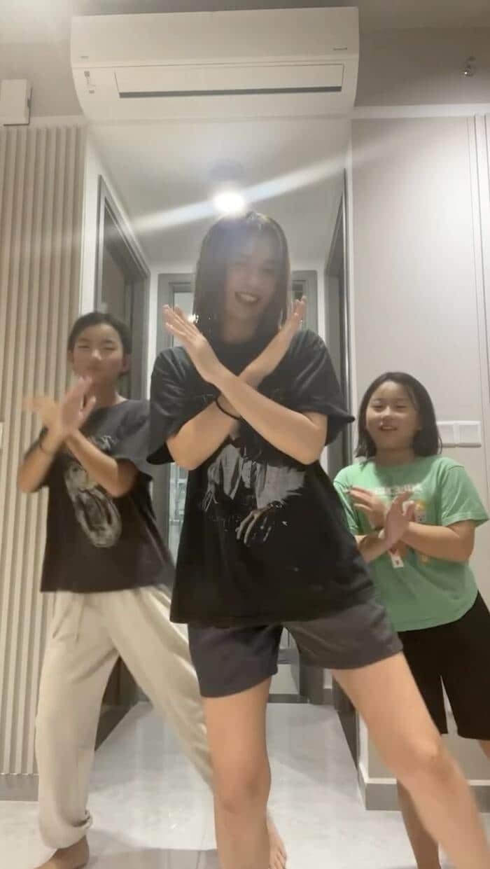 センターに立つ優木さんは、髪の毛がまだ少しぬれた状態のままのTシャツ短パン姿で、手をクロスさせたポーズでリズムにのっています。後ろには、真顔で立つ娘たちの姿も。