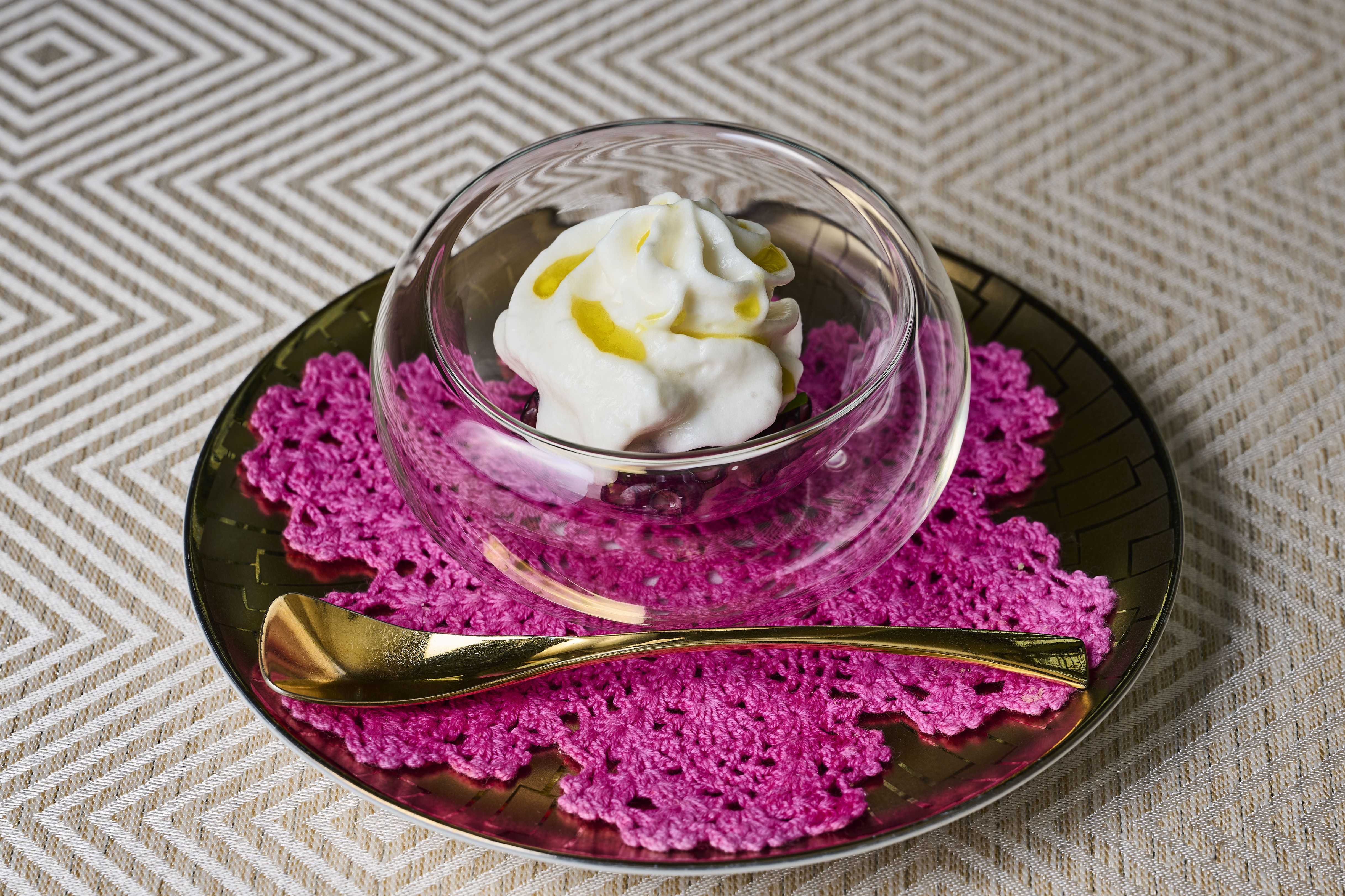 (左)焼き芋のポタージュ ハーブ香る焦がしバターのエスプーマを合わせて