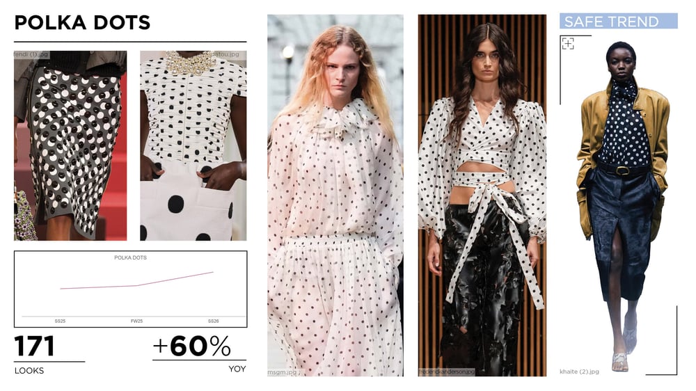 80s-inspired floral prints make a vibrant comeback, merging nostalgic exuberance with modern techniques like layering, digital precision, and bold color contrasts to create a lively, joyful mood. Light checks bring structure and versatility, appearing in both playful and tailored contexts, adding clarity and balance to fluid silhouettes. Polka dots introduce a whimsical yet timeless touch, energizing collections with their rhythmic patterns and playful elegance. Together, these motifs define the season’s expressive, statement-making aesthetic, blending nostalgia, individuality, and contemporary flair.