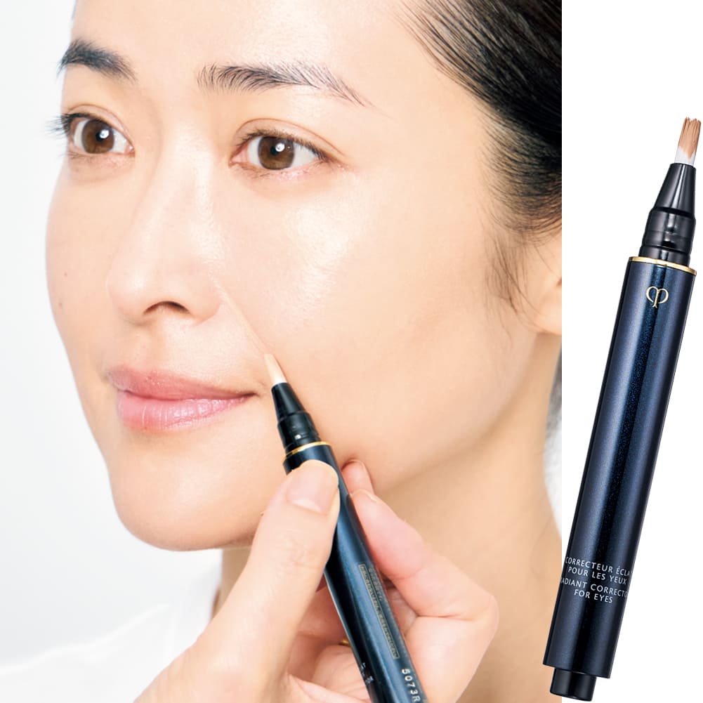 ファンデ後の肌の、目の下のクマや、法令線など気になる部分のみ軽く筆タイプのコンシーラーを使用。直接のせて、指先で広げすぎないように軽く伸ばして馴染ませます。ヨレずに美肌印象へと格上げするリキッド状コンシーラー。クレ・ド・ポー ボーテ コレクチュールエクラプールジュー NO ¥6,480(クレ・ド・ポー ボーテ)