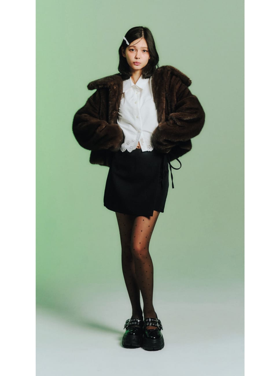 ファーブルゾン¥17600/CALNAMUR ブラウス¥15950/マルディメクルディ ジャパン(マルディメクルディ) スカート¥2969/PHILLY ヘアピン¥777/NADIA FLORESEN EL CORAZON ストッキング¥1100/タビオ(靴下屋) シューズ¥9790/R&E ●商品情報はViVi2025年12月号のものです。