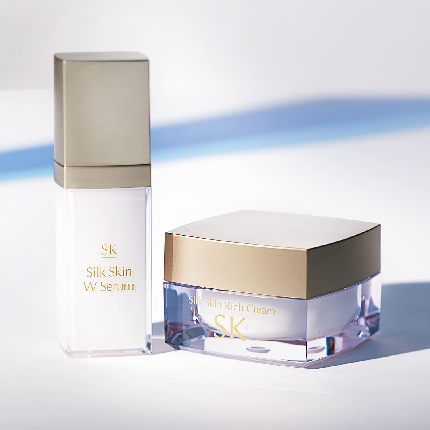 左から:SKシルクスキンWセラム[医薬部外品]28ml ¥16,500、シルクスキンリッチクリーム[医薬部外品]50g ¥22,000(シルクドリバー)