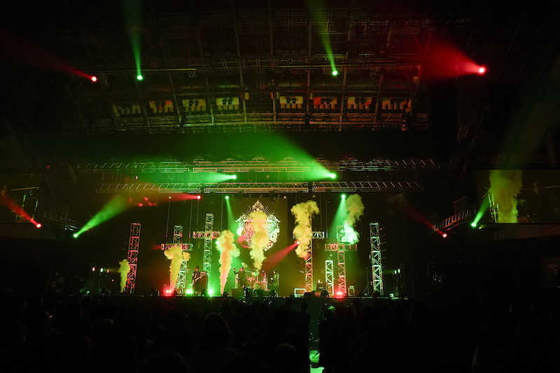 「ラスト行くぞー!」の声で始まったのは「FOR BEAUTIFUL MAD HUMAN LIFE」。ツーバスをフルに生かしたパワフルなロックビートは、アグレッシブに攻める前半と、グッとテンポダウンして邪悪な雰囲気たっぷりに聴かせる中盤とのコントラストも鮮やか。HAKUEIのボーカルにユニゾンして、千聖とO-JIROがオクターブ下をダブルで歌う響きも邪悪さに拍車をかける。後半ではステージ上下から火花が吹き出し、さらに高揚感がアップ。激しさに徹した演奏だったが、不思議な爽快感と開放感に包まれつつ彼らのライブは幕を閉じた。
