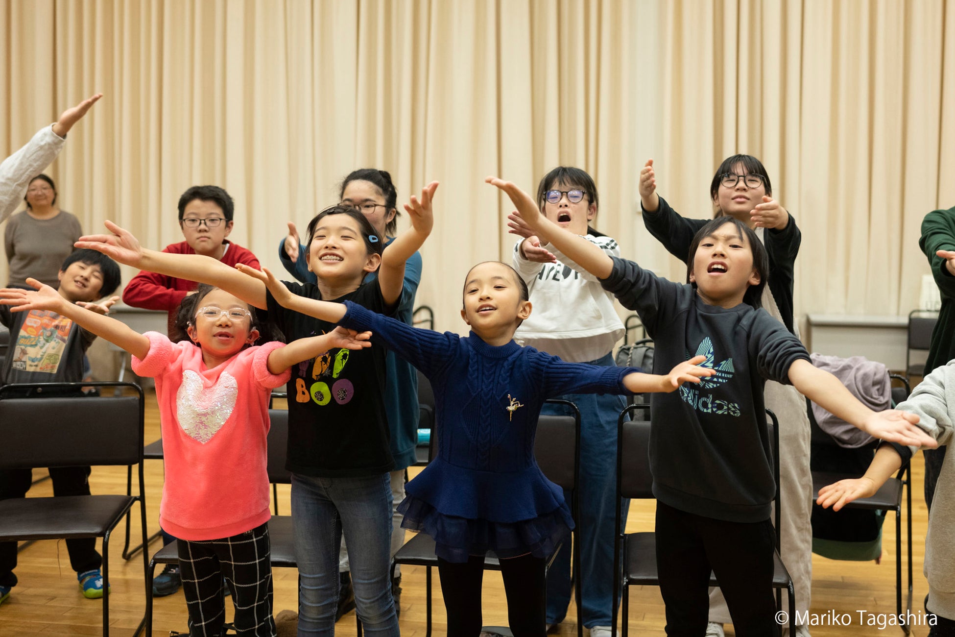 手を広げて手歌パフォーマンスの練習中。