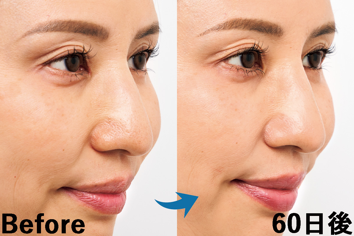 ぽてっと広がり少しむくんでいた小鼻が、スッキリと鼻筋が通った美鼻になりました。長めに刻まれた法令線も短くなって口元にも効果あり。存在感のあった鼻が目立たなくなって美人の忘れ鼻へと変化しました。