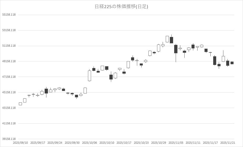 11月25日前場の東京株式市場は反発。日経平均株価は、前営業日比189円39銭高の4万8815円27銭で午前中の取引を終えた。前日の米国株高を好感して買い優勢で始まり、一時556円高まで買われた。ただ、米国の株価指数先物が時間外取引で軟調に推移していることもあり、戻り待ちの売りが出ているようだ。、