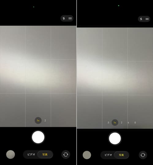 カメラアプリの標準倍率はiPhone Air(左)が1/2倍、iPhone 17 Pro Max(右)は0.5/1/2/4/8倍と幅広い。またデジタルズームは40倍まで対応するまずは店頭で手に取ってみるべき