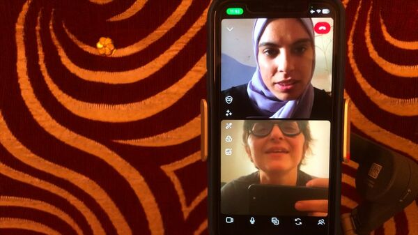 ビデオ通話で気丈に振る舞うガザ在住のフォトジャーナリスト、ファトマ・ハッスーナ ©Sepideh Farsi Reves d’Eau Productions