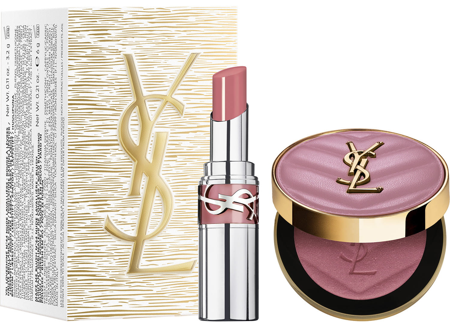 YSL シグネチャーカラー“44 ヌード ラヴァリエール”のフレンチモードなミルキーピンクのメイクセット。ヴェールのようなふんわり発色と、煌めきを放つ「YSL メイクミーブラッシュ パウダー 44」と、シアーな発色でみずみずしいツヤを放つ「YSL ラブシャイン リップスティック 44」による、洗練さと官能性を秘めたカラーコンビネーション。