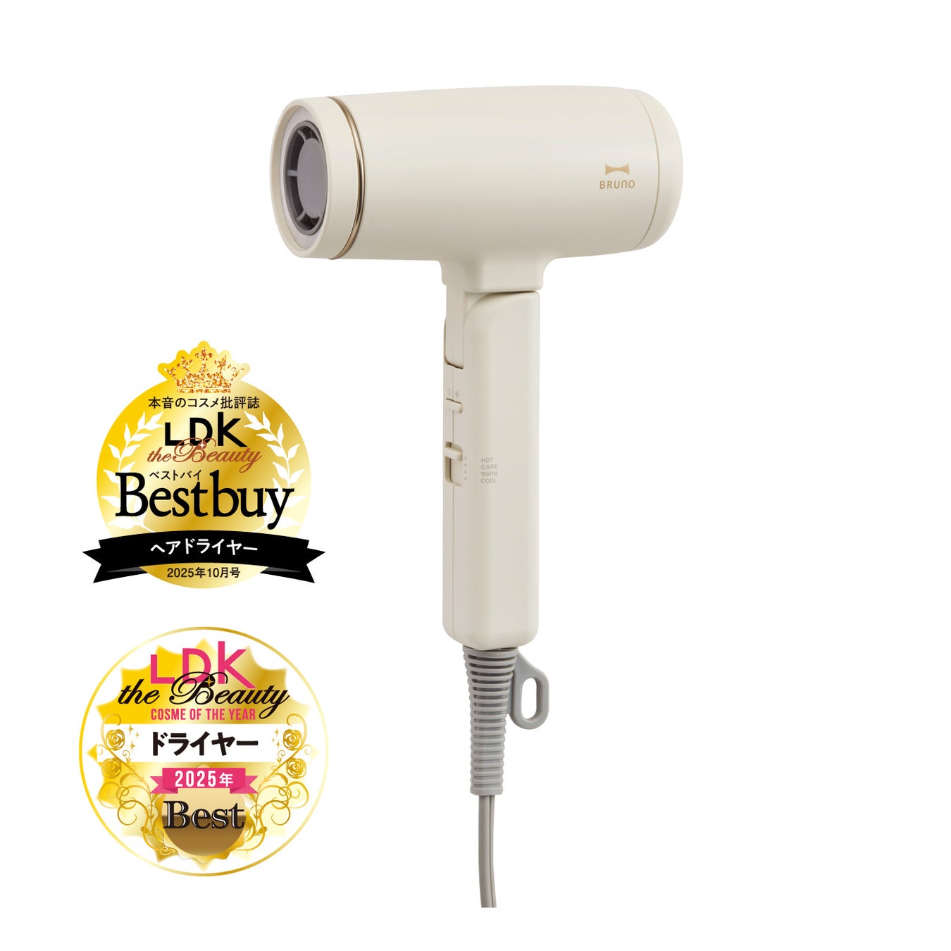 インテリア雑貨およびライフスタイル商品の企画/開発/販売を⾏うBRUNO株式会社(本社:東京都新宿区、代表取締役社長:塩田徹)は、2025年11月21日(金)発売の『LDK the Beauty 2026年1月号』のベストコスメ Awards 2025、4060個の中から選ばれたべスコスとしてドライヤー部門にて『コスメ・オブ・ザ・イヤー 2025』を受賞したことを発表いたします。本製品は、同誌2025年10月号でも『2025年10月号ヘアドライヤー部門ベストバイ』に選出されており、編集部や専門家などの第三者から高い評価を獲得。これにより2冠を達成し、デザイン性と機能性の両立が、今“日常をととのえるドライヤー”としてますます注目の美容家電として話題になっています。