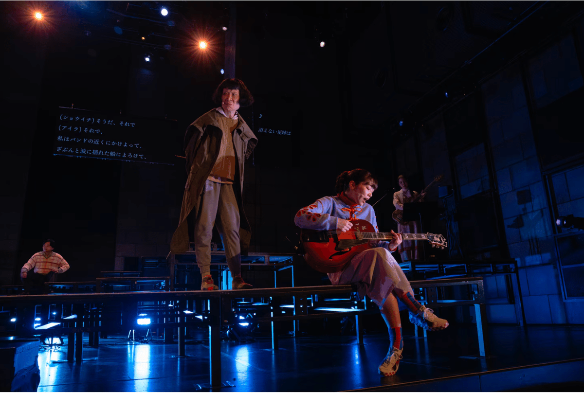 また、この高低差のある床面が存在しないステージ手前の部分やステージ奥側の部分もあって、そこにショウイチがいたりすると、彼は海の中に身を投げてしまって、もう死んでしまって漂っている存在にも思えるのでとても上手い演劇の見せ方だとも思った。