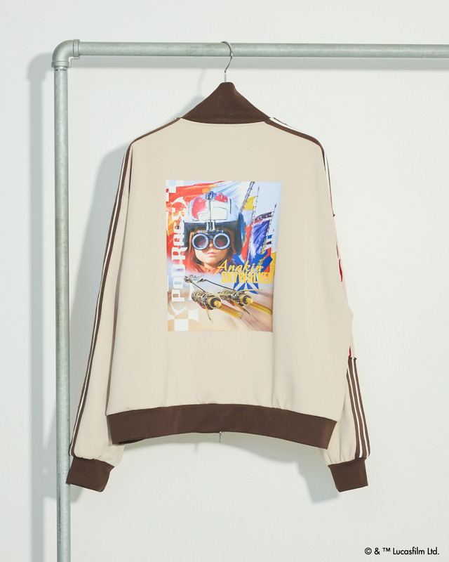 注目のトラックジャケットは、エピソード1から3の主人公「アナキン・スカイウォーカー」が自作のポッドレーサーでレースに挑むシーンをバックプリントで表現している。「スター・ウォーズ」の世界観をそのままに、ストリートテイストを効かせた遊び心あふれるデザインに仕上げた。