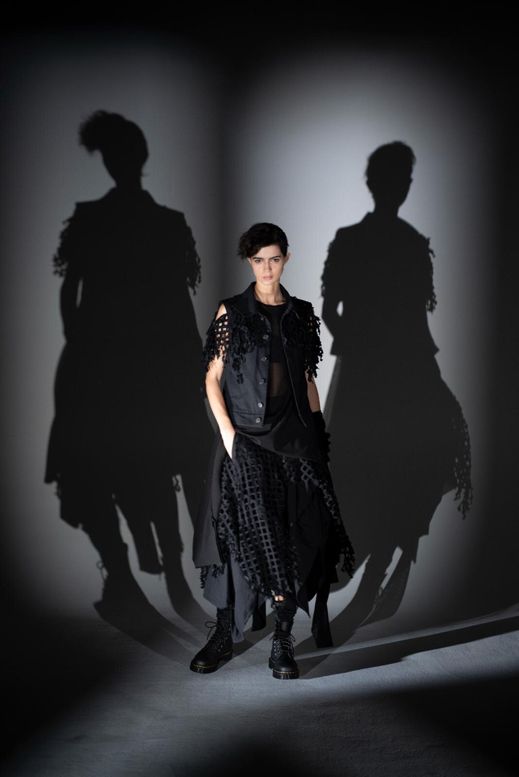 墨染めを施したチャコールグレーのパフスリーブコートやロングシャツは、製品染め特有のシワやアタリ感に加え、経年変化によって風合いの味わい深さが増す。奥行きがあり、ブラックの生地とはまた異なる凛としたムードをまとっている。また、断ち切りのデニムパーツを重ねて独特のシルエットに組み立てたワンピースやベストは、着るほどに切り口が少しずつほつれ、唯一無二の表情へ育っていく。