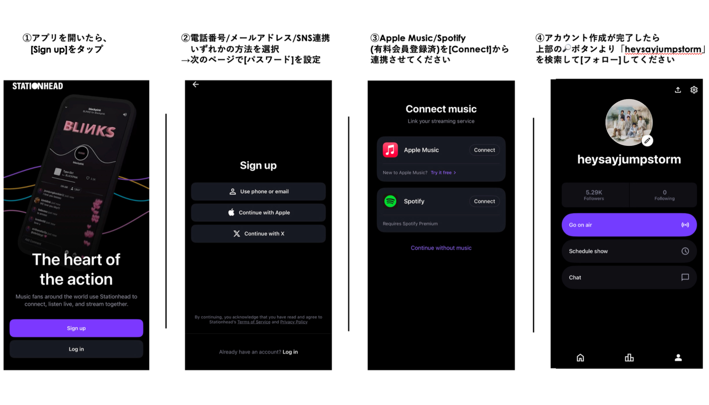 ★上記の方法で見つからない場合は、Stationheadアプリの検索画面にて「heysayjumpstorm」を検索して、「ON AIR」表示のステーションにご参加ください!