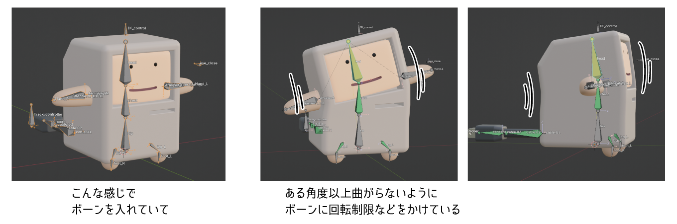 この作成済みのモデルをアニメーションさせるために、いくつかの設定をおこないました。ここでは各モデルを紹介しながら、わたしがどのような設定をおこなったかを見ていきます。