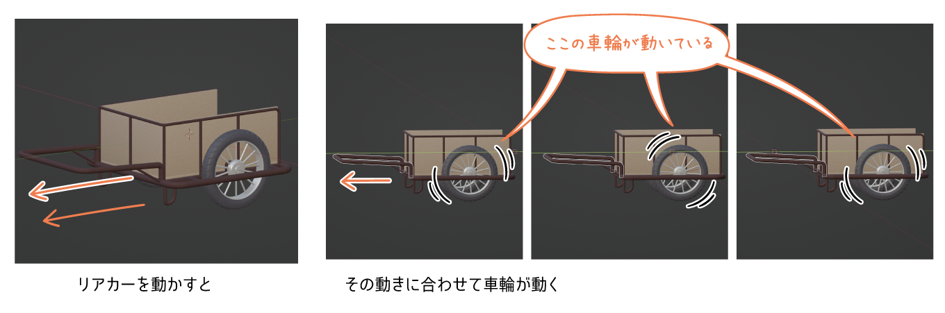 リアカーは動かすと車輪が自動的に動くように、ドライバーという機能を使いました。