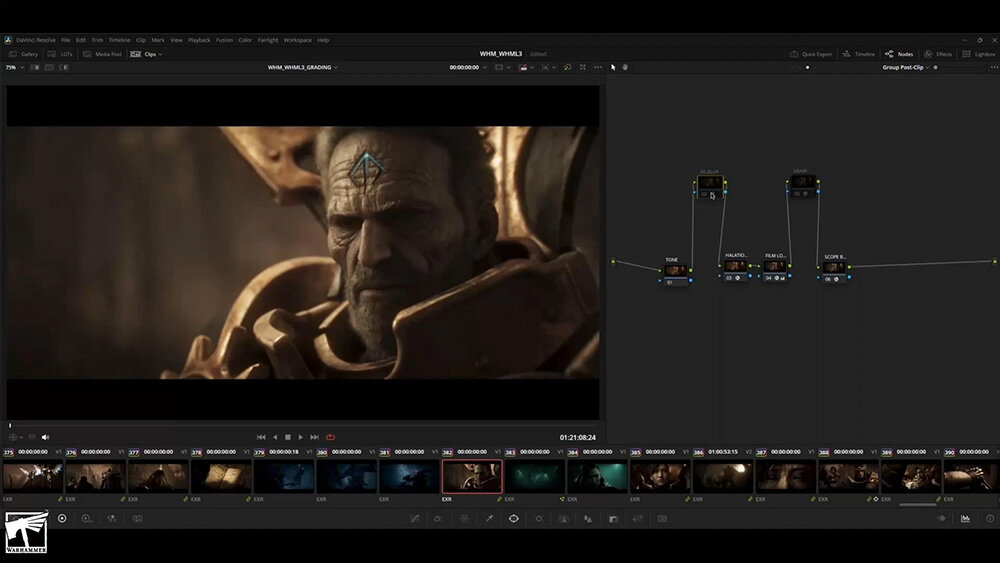 ほかにもハイライト部分にビネット処理やドッジ&バーンを加えたり、DaVinci Resolveのグループノードを使って一気に全体をグレーディングするなどの処理を行なった後、少しだけシャープネスを加える。