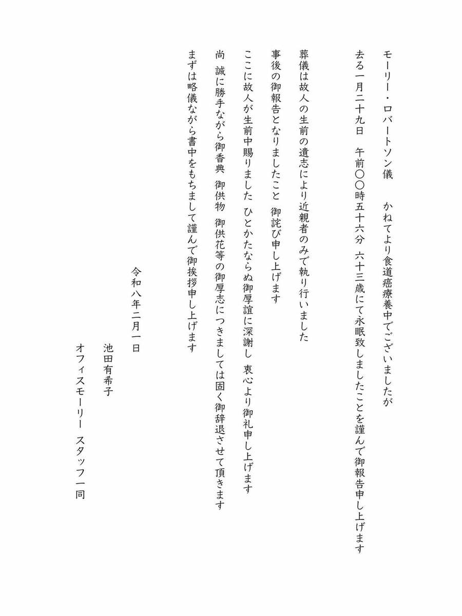 続けて「葬儀は故人の生前の遺志により近親者のみで執り行いました 事後の御報告となりましたこと 御詫び申し上げます」と、記しました。