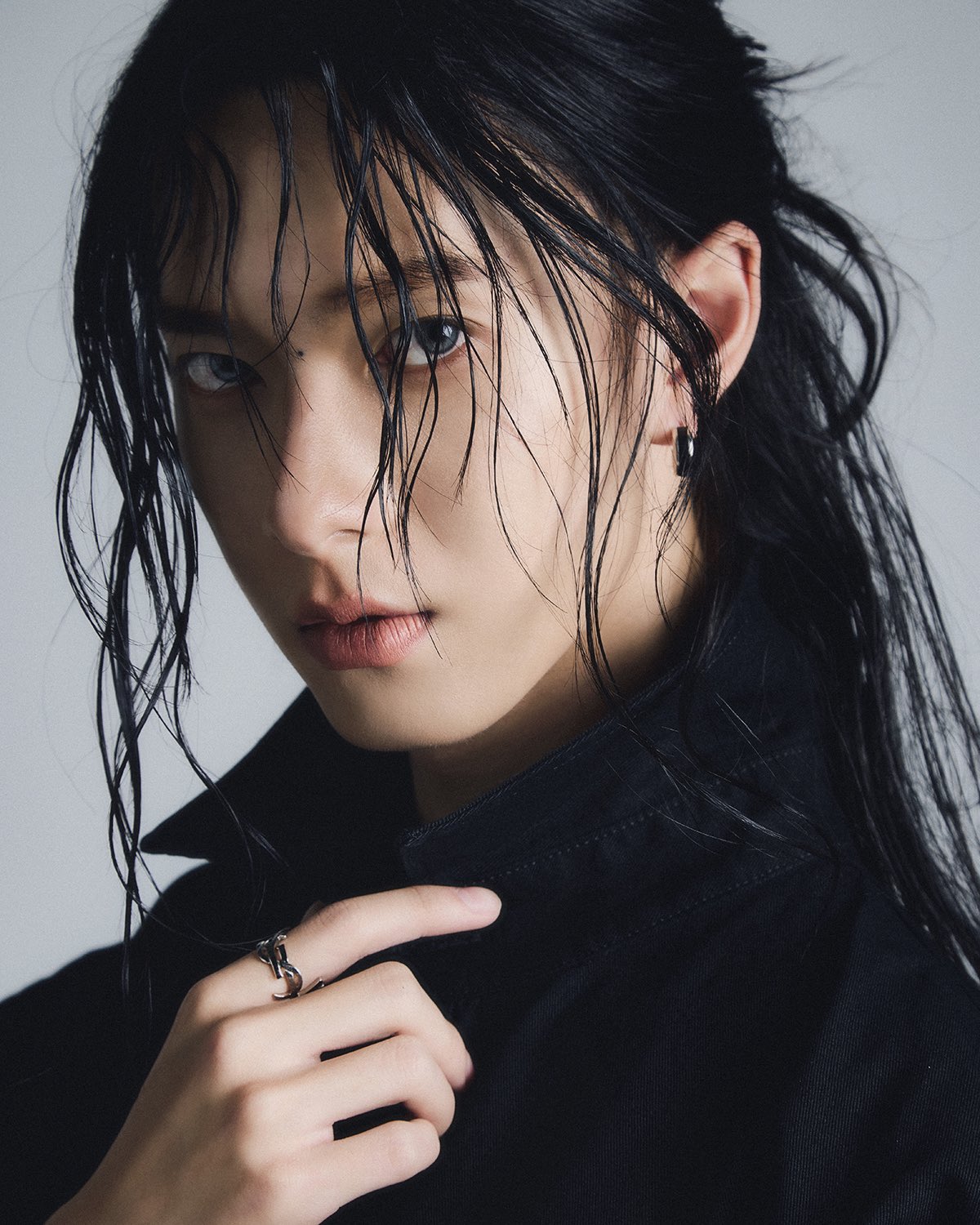 今回の撮影でプーは、サンローランのシグネチャーロゴが胸元に刺繍された漆黒のシャツを完璧に着こなし、全身をモノトーンで統一。ウェットな質感で仕上げたロングヘアが彼の端正な顔立ちを際立たせ、静謐ながらも力強い、ミステリアスな美しさを放っています。モードな装いの中に遊び心のあるハットを取り入れたルックでは、ハイファッションを自在に操るモダンなセンスを披露しました。
