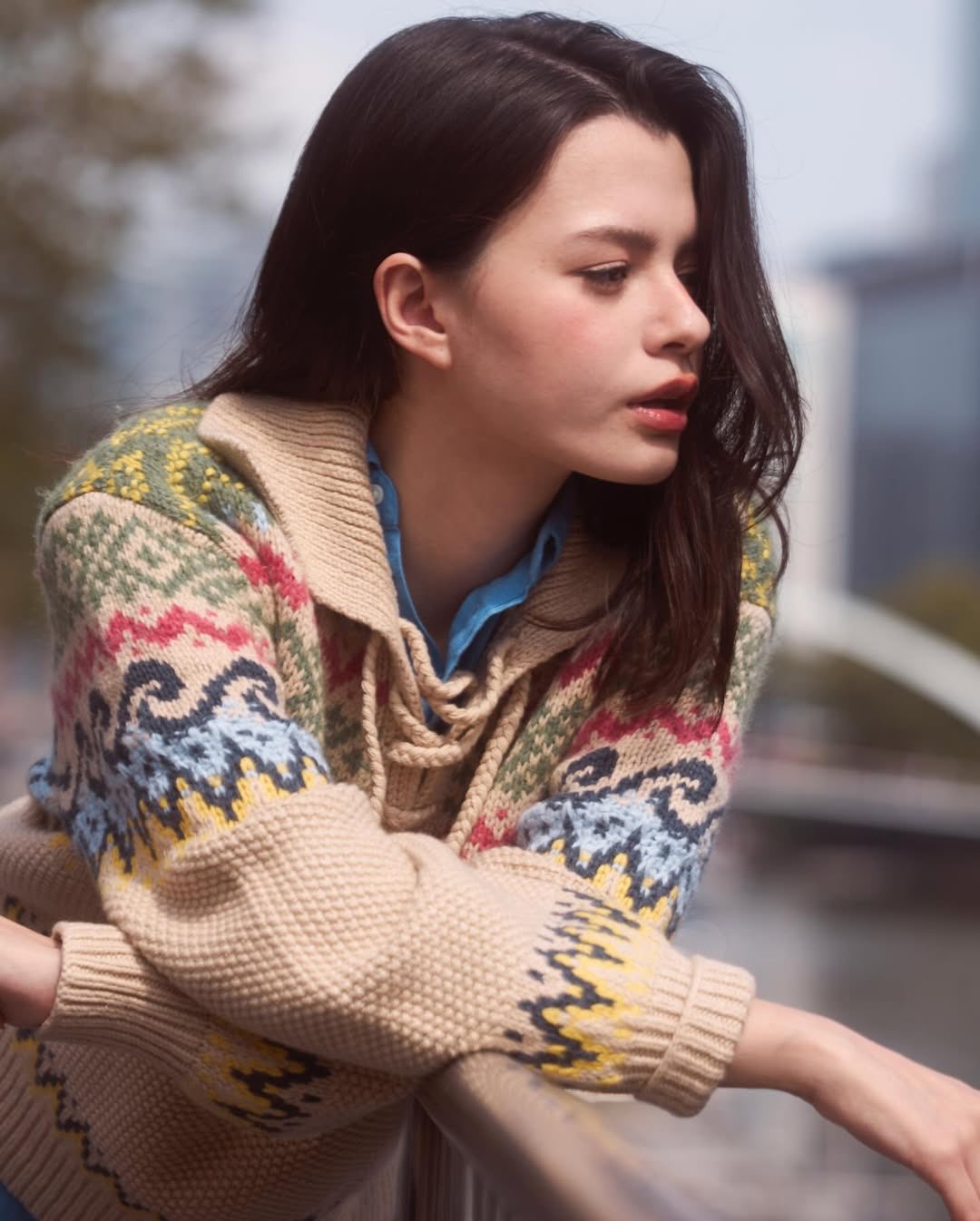 今回披露されたスタイリングで特に注目したいのが、温もりを感じさせるノルディック柄のニット。首元が印象的なこの一枚に、あえて爽やかなブルーのシャツをレイヤードすることで、冬の装いに清潔感とこなれ感をプラスしています。また、別のカットではシックなダークブラウンのカーディガンにサングラスを合わせ、都会的で洗練された大人カジュアルを演出。手元には「Polo」のロゴが映えるカラフルなニットバッグを添えるなど、小物使いで遊び心を加えるテクニックは、今すぐ手持ちのアイテムで真似したくなるようなヒントが満載です。