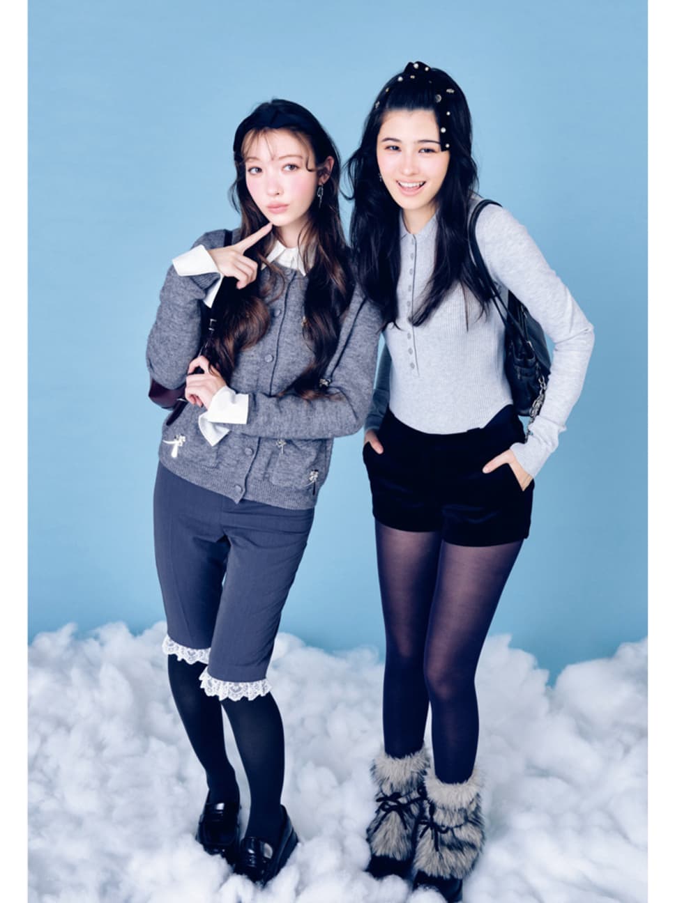 【左・サクラ】シャツ/着回し ビジューニットカーディガン¥27500/The Girls Society サブリナパンツ¥11990/être loin タイツ¥1980/BLONDOLL新丸の内ビル店(17℃) リボンカチューシャ¥19800/THE HAIR BAR TOKYO ピアス¥3630/サンポークリエイト(ミミサンジュウサン) バッグ¥10900、ローファー¥10900/CHARLES & KEITH JAPAN(CHARLES & KEITH) 【右・アリアナ】ロングトップス、カバーブーツ/着回し ベロアショートパンツ¥11990/バロックジャパンリミテッド(MOUSSY) ビジューリボンバレッタ¥2420/GOLDY ピアス¥3960/805showroom(Matilda rose) チャーム付きバッグ¥9790/EMODAルミネエスト新宿店 タイツ¥1980/BLONDOLL 新丸の内ビル店(17℃) ●商品情報はViVi2026年2/3月号のものです。