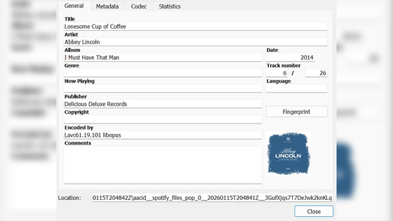 公開されている音楽ファイルの情報画面が以下。タイトルやアーティスト名だけでなくカバーアートまで含んだデータのようです。