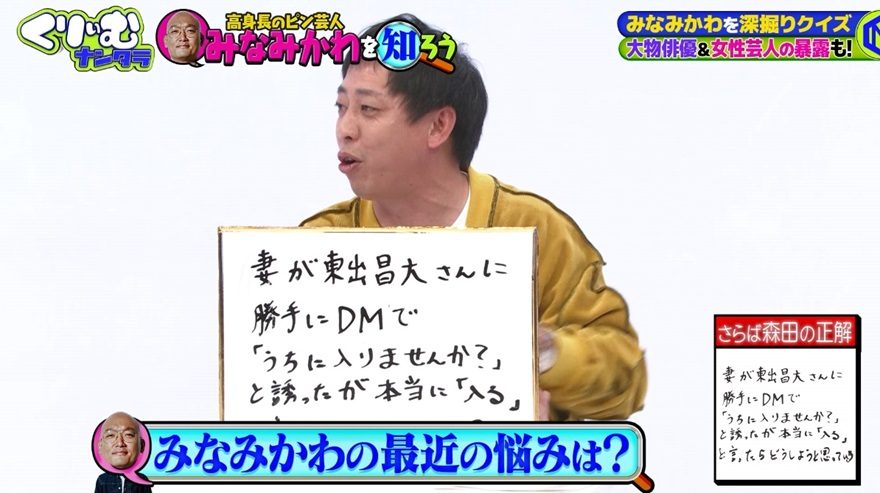 みなみかわを熟知する森田哲矢(さらば青春の光)が発表した“正解”は、現在フリーで活動する俳優・東出昌大に関するものだった。なんと、みなみかわの妻が東出に対し、独断で「事務所に入りませんか?」とスカウトのダイレクトメッセージ(DM)を送っていたというのだ。