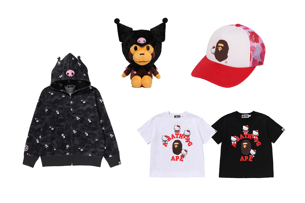 「ア ベイシング エイプ®(A BATHING APE®)」は、サンリオのキャラクター、クロミとハローキティとハローキティとのコラボコレクションを制作。アイテムは、クロミとハローキティそれぞれを落とし込んだ2デザインを各型で用意し、本コラボに向けて特別にデザインしたオリジナルカモフラージュ柄の “フルジップフーディー”(3万800〜4万6200円)などをラインアップする。