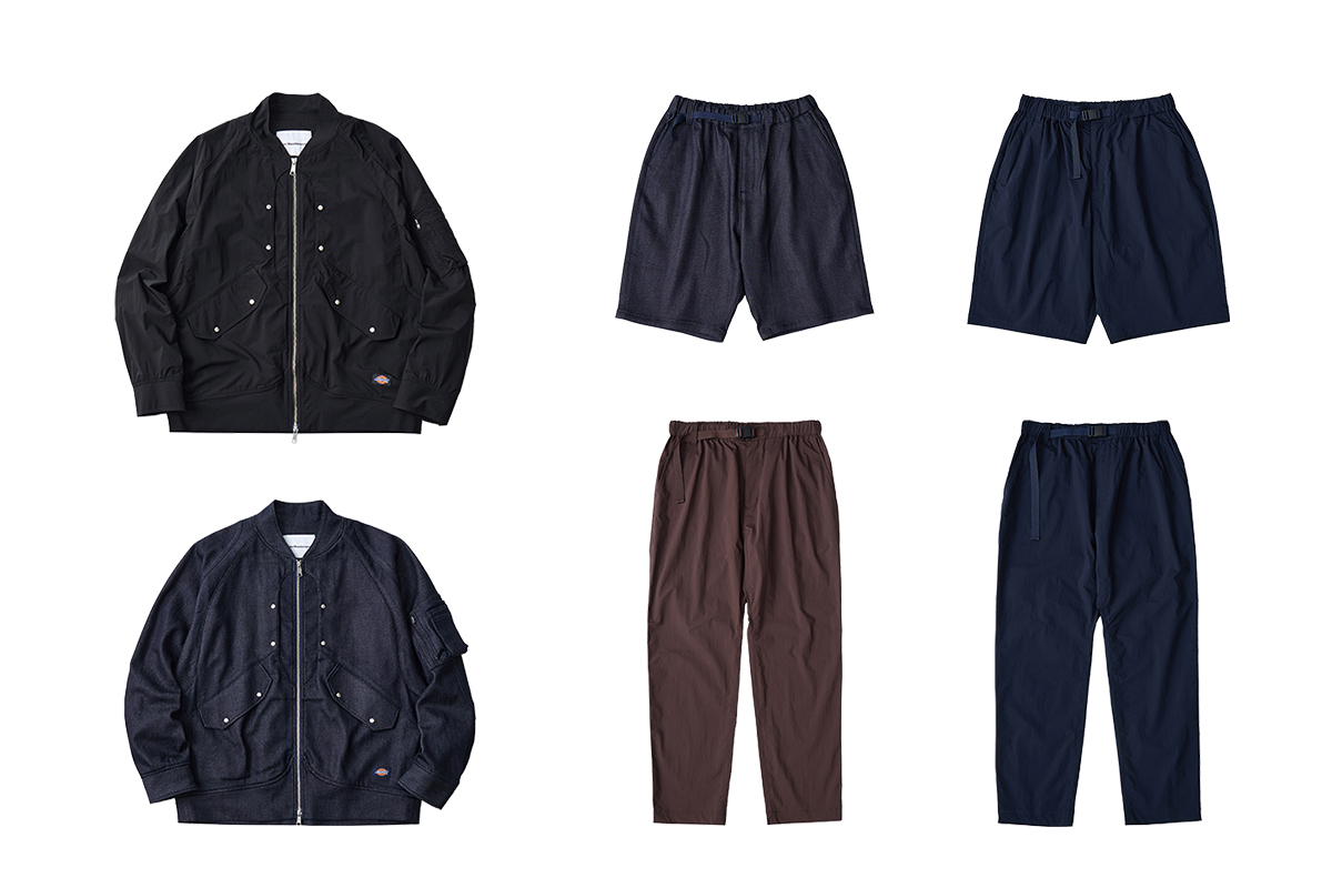 「ホワイトマウンテニアリング(WHITE MOUNTAINEERING)」は、「ディッキーズ(DICKIES)」と初のコラボコレクションを制作。アイテムは、デニムとナイロンの2種類で展開するボトムス3型とブルゾン(6万3800〜6万9300円)をラインアップするほか、ナイロン素材のワークシャツ(全3色、4万6200円)も用意する。
