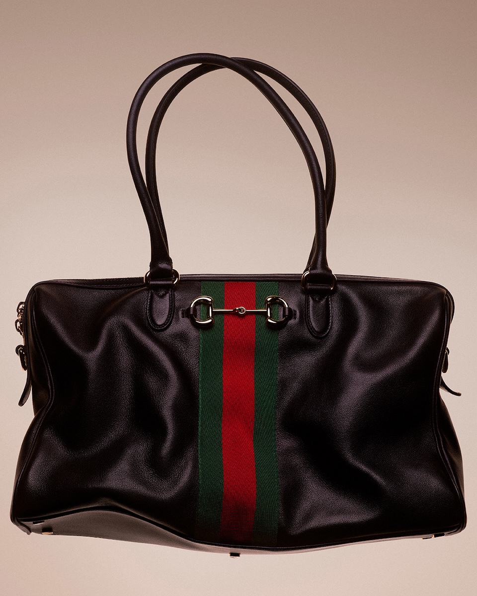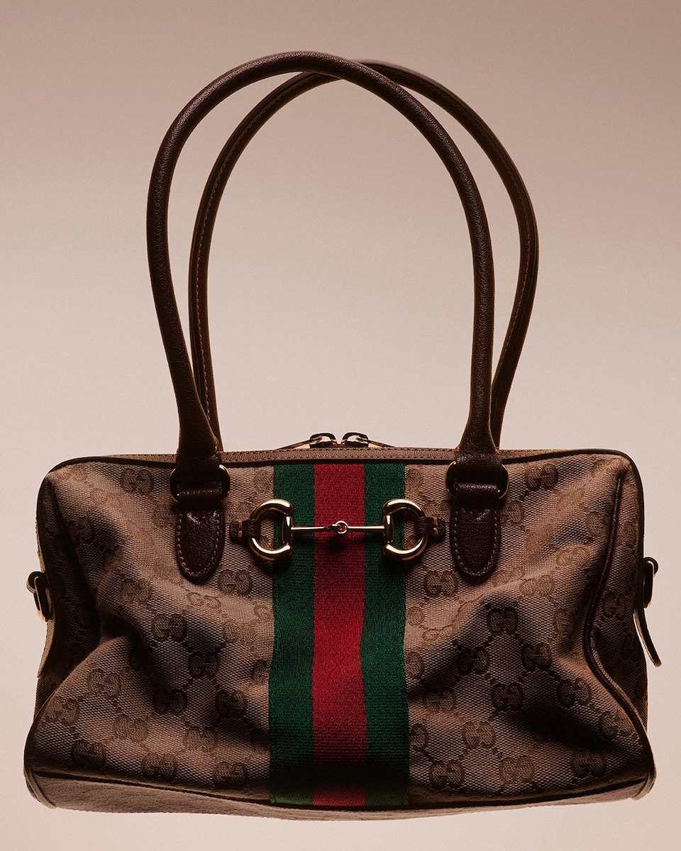 シグネチャーのホースビット ハードウエアが「グッチ」の伝統的なデザインコードを受け継いだアイテムとしての存在感を際立たせている。ダークブラウンのスエード、ブラックのソフトレザー、ビンテージ サイドのGGパターンといった洗練された素材とカラーをそろえた。