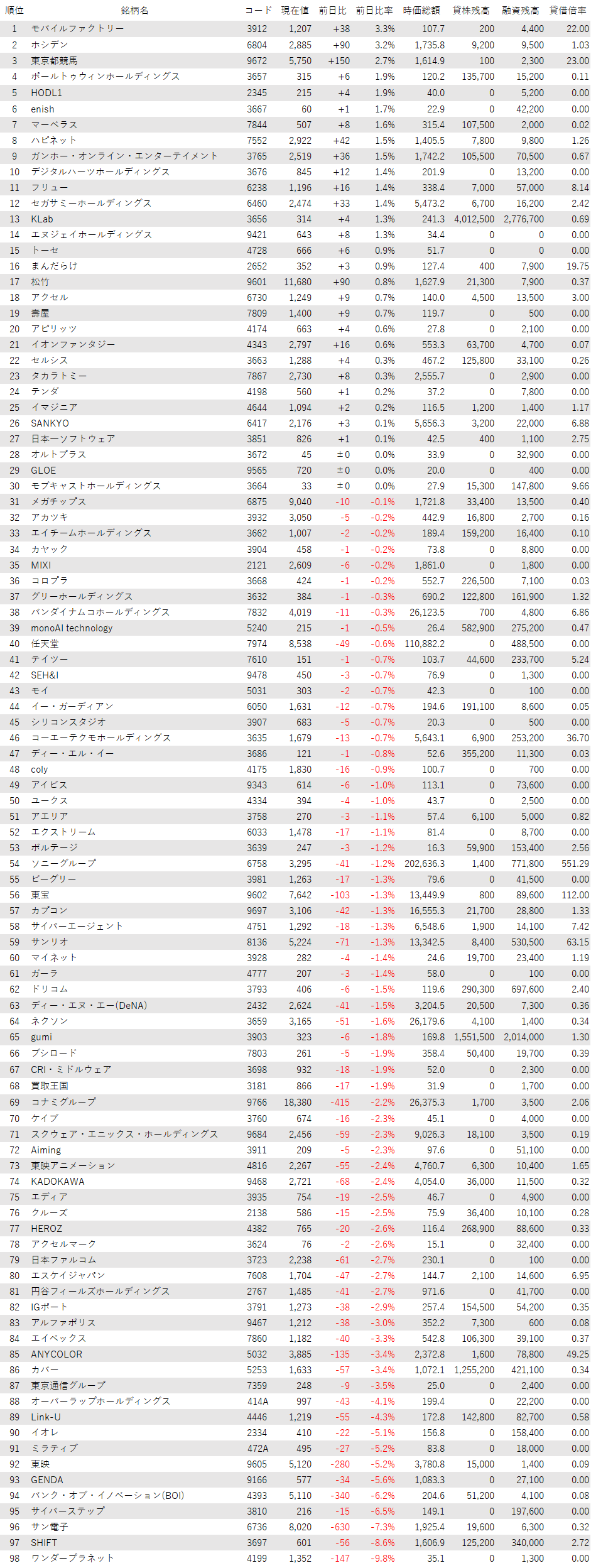 こうしたなか、ゲーム・エンタメ関連企業をみると、登録されている98銘柄のうち、上昇は27銘柄(28%)、下落は68銘柄(69%)、変わらずは3銘柄(3%)で、売り優勢だった。
