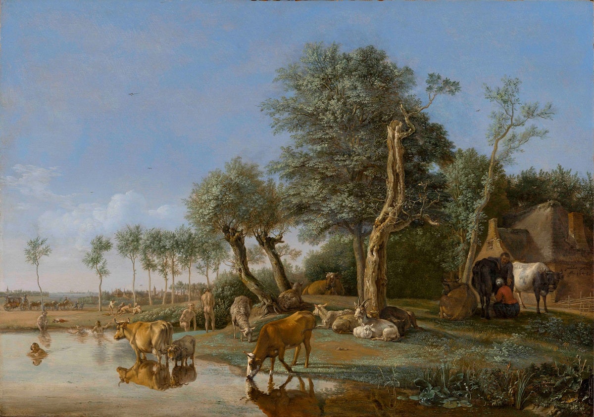 パウルス・ポッテルは牛の絵で知られるオランダの画家。画家であった父に学び、早熟の才能を示しました。結核によりわずか28歳で夭逝するまでに、百点近い作品を残しました。マウリッツハイス美術館には、ポッテルの代表作《若い牡牛》という大作があります。19世紀まではフェルメールよりも有名な画家でした。この絵は、輝かしい夏の日の情景を描いたものです。人々は水辺で楽しんでおり、牛たちはそれを見守り、木陰や池で涼を求めています。ポッテルは水面に映る反射を巧みに描き、そのためこの絵は「映る牛」という愛称で親しまれてきました。ポッテルは動物たちを忠実に細部まで描いていますが、彼はスケッチ帖を持ち歩いて動物を個別にスケッチし、後でそれらを統合して制作しました。
