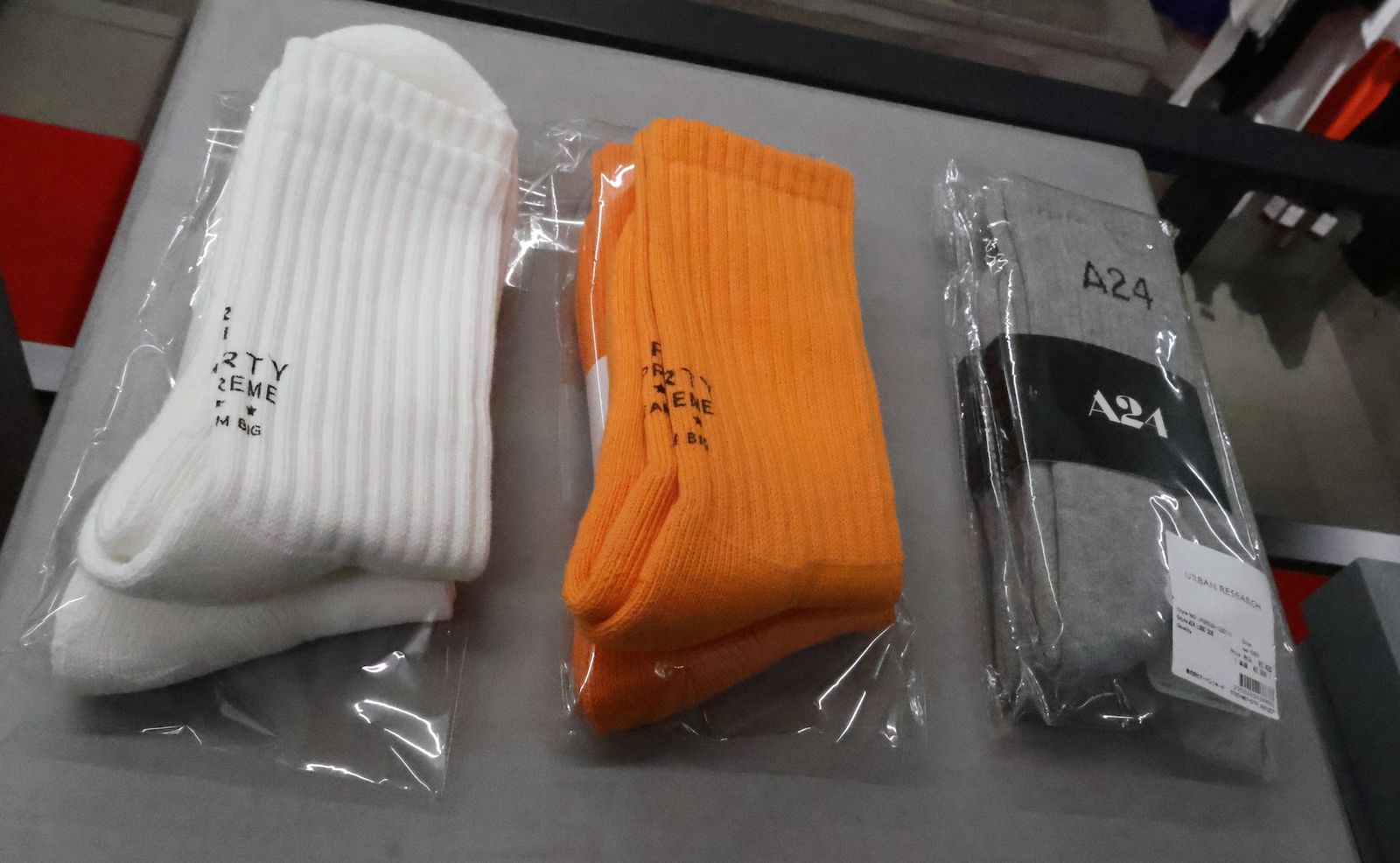 ソックス。左2色がコラボソックス。一番右はA24のソックス