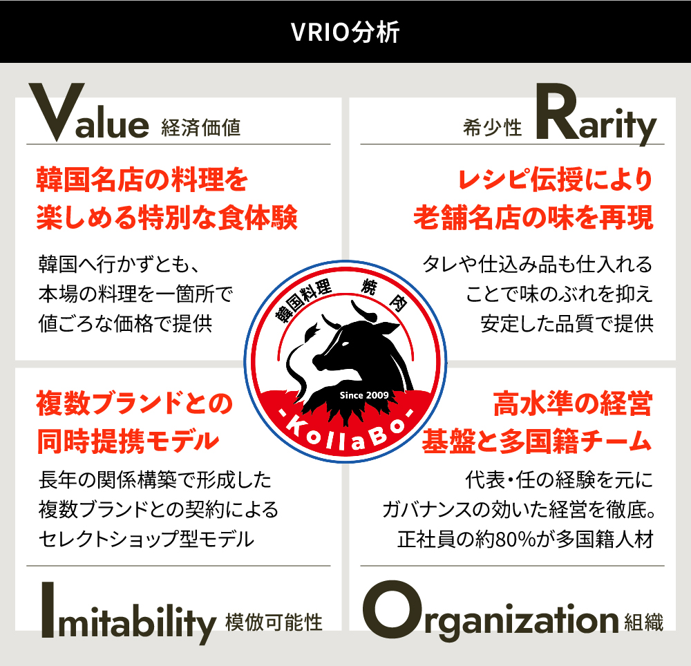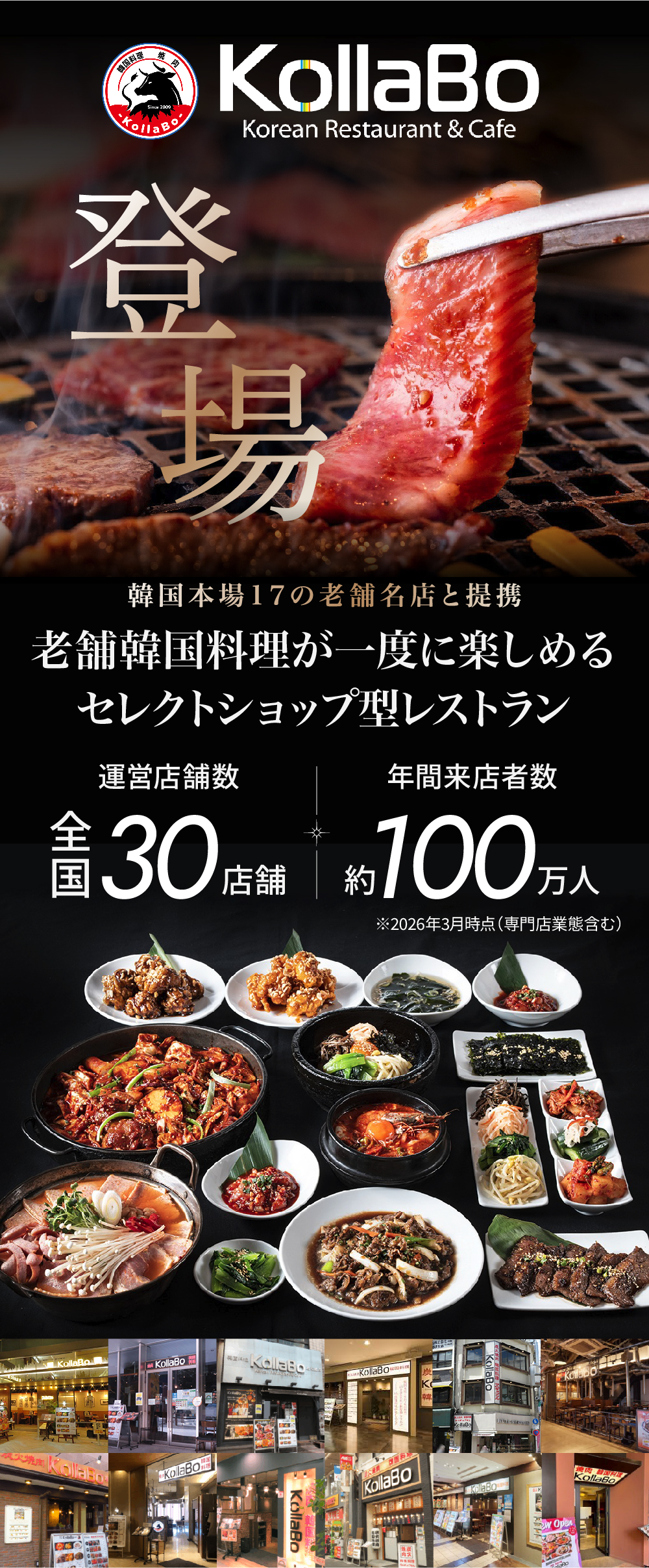 発行者は、韓国本場の老舗店17ブランドと提携し、それぞれの看板メニューを一つの店舗で楽しむことができるセレクトショップ型の韓国料理・焼肉レストラン「KollaBo(コラボ)」を展開しています。「KollaBo」の最大の特徴は、創業50年を超えるような韓国の老舗専門店と提携し、レシピや調理ノウハウの提供を得ることで、本場の味を保ちながらチェーン展開を可能にした「統合型」のビジネスモデルにあるとしており、韓国本場の伝統レシピに、在日韓国人が創り上げた焼肉や惣菜文化、日本の食材・サービスを掛け合わせることで、本格性と再現性を両立した点にあると考えています。さらなる拡大戦略として、カンジャンケジャン専門店や韓国デザートカフェ「クムコーヒー」などの業態の展開も開始しており、「KollaBo」に加えて複数ブランドでの店舗展開を進めているとしています。将来的には日本国内にとどまらず、海外展開も検討しており、世界中の人々が本物の韓国料理を楽しむことができるグローバルブランドの確立を目指しています。
