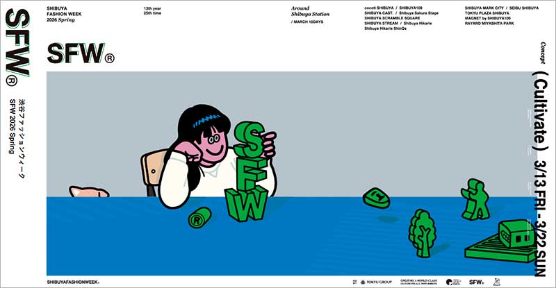 開催中 SFW 渋谷ファッションウィーク2026春(3/13〜3/22)の注目企画「THE CULTIVATE MARKET by SFW」(3/20.21 @渋谷サクラステージSHIBUYAタワー3階)や、「THE STAMP RALLY」「THE SHOPPING」などは、また別でレポートするから、まずは公式サイトをチェックして、渋谷に出かけてみて↓↓↓