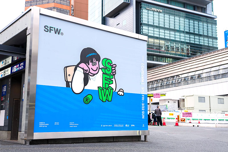 まずは、Face Oka が描き下ろした渋谷ファッションウィーク キービジュアルが、渋谷のあちこちに出現する「THE CITY DRESSING」について。