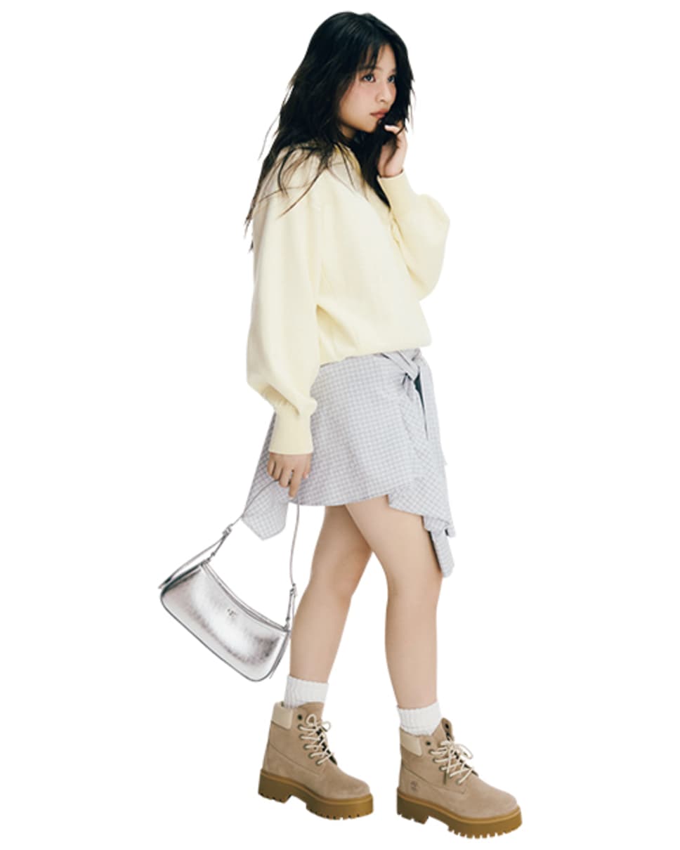 ハーフジップニット¥9900/バロックジャパンリミテッド(MOUSSY) チェックミニスカート(※4月発売予定)¥8470/ムルーアルミネエスト新宿店 バッグ¥24200/カルバン・クライン カスタマーサービス(カルバン・クライン) ソックス¥1210/タビオ(靴下屋) ショートブーツ¥30000/VFジャパン(ティンバーランド) ●商品情報はViVi2026年4月号のものです。