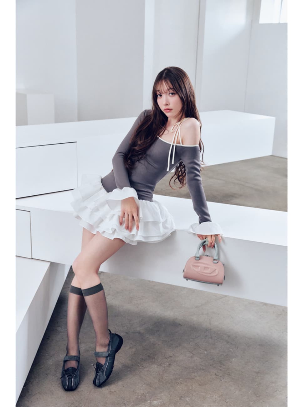 フリルミニワンピース¥12100/Darich バッグ¥59400/DIESEL JAPAN(DIESEL) シアーソックス¥1210/タビオ(靴下屋) シューズ¥15950/トヨダトレーディング プレスルーム(ロックフィッシュウェザーウェア) ●商品情報はViVi2026年4月号のものです。