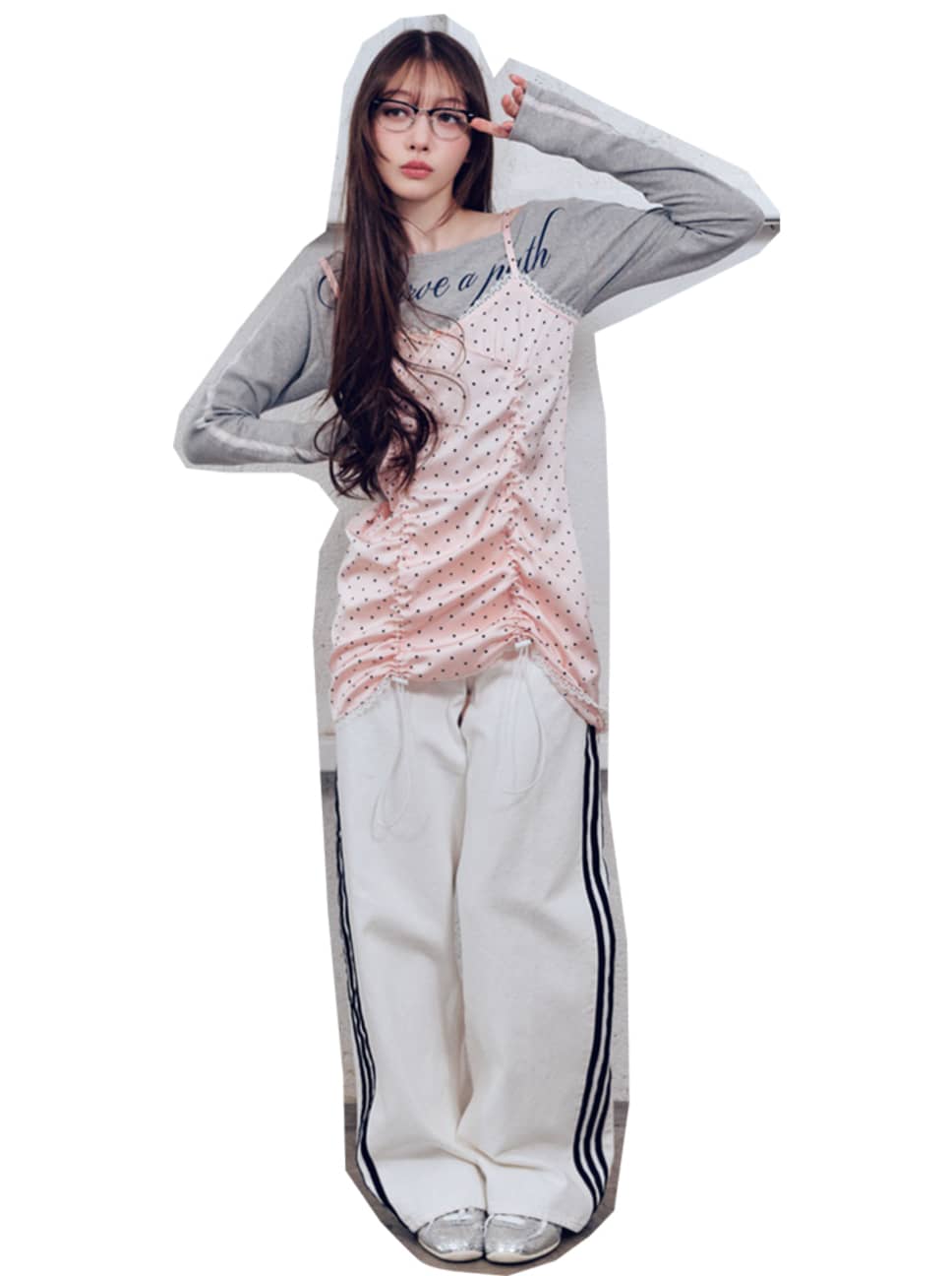ドットキャミワンピース¥4949/W♡C ロンT¥5390/EMODA ルミネエスト新宿店 ラインパンツ¥15400、スニーカー¥17600/アディダス コールセンター(アディダス オリジナルス) メガネ¥27280/ルックスオティカジャパン カスタマーサービス(レイバン) ●商品情報はViVi2026年4月号のものです。